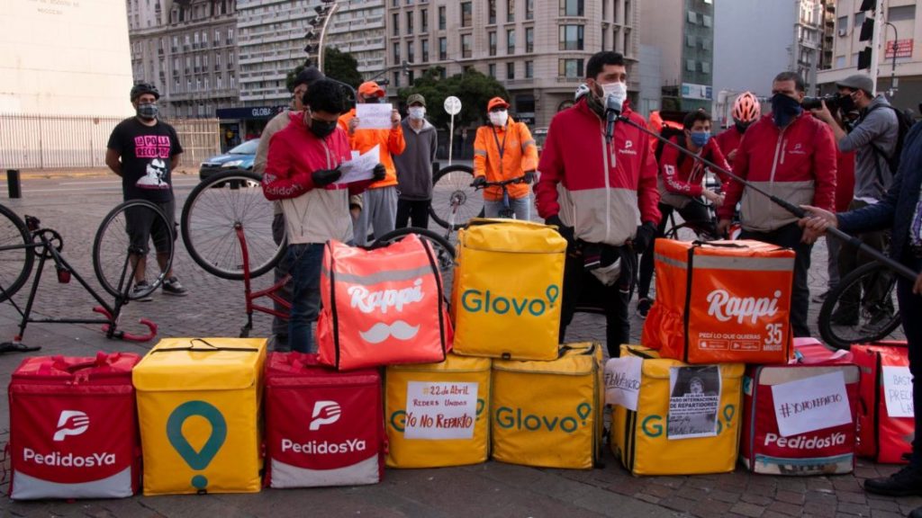 Quali erano le rivendicazioni di chi scioperava? Le app partono dalla stessa premessa: triangolare i rapporti di lavoro pur non riconoscendolo. Tuttavia, ognuna ha le sue particolarità. Poiché si trattava di uno sciopero di chi lavora per queste tre app, c’erano richieste specifiche per ciascuna di esse. Vale la pena ricordare che lə fattorinə in tutte le app sono pagatə per ogni ordine che consegnano, in base al chilometraggio: ogni chilometro percorso ha una tariffa. Tuttavia, nel caso dell’app PedidoYa, il chilometraggio non viene più conteggiato sulla base del percorso GPS di Google Maps, ma utilizzando un sistema chiamato calcolo di Manhattan. Questo nuovo metodo si basa sul tracciamento di una linea retta tra il punto A e il punto B, cioè un chilometraggio inferiore a quello reale. Non si tiene conto della topografia della città, dei sensi di marcia delle strade o dei segnali stradali. Questa è una delle prime rivendicazioni di chi effettua le consegne per quest’app: che ci sia un conteggio equo dei viaggi e quindi dei pagamenti. Un’altra richiesta è il riconoscimento monetario anche quando un ordine viene cancellato e, dunque, che vengano pagati il tempo impiegato e i viaggi già fatti. Inoltre, la sicurezza è un problema che ogni rider deve affrontare, ci sono continue rapine e ordini fantasma, quindi chi lavora per PedidosYa chiede con urgenza di delimitare le zone di consegna, tenendo conto della sicurezza.